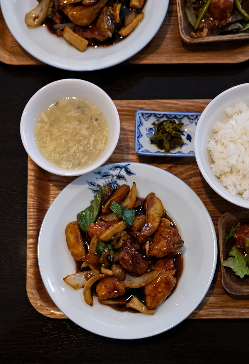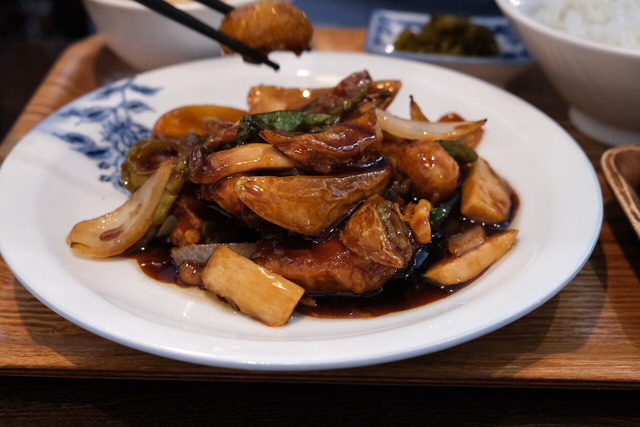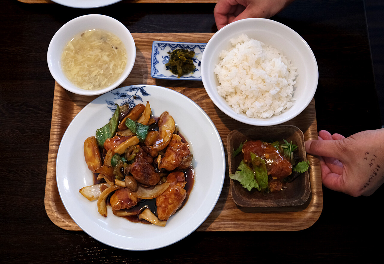 お昼は【杏仁荘】の今週の週替わり定食は、夏野菜の黒酢鶏定食。「ご飯イケるやつですよ。ご飯大盛りですよね?」「そうなるよね」
