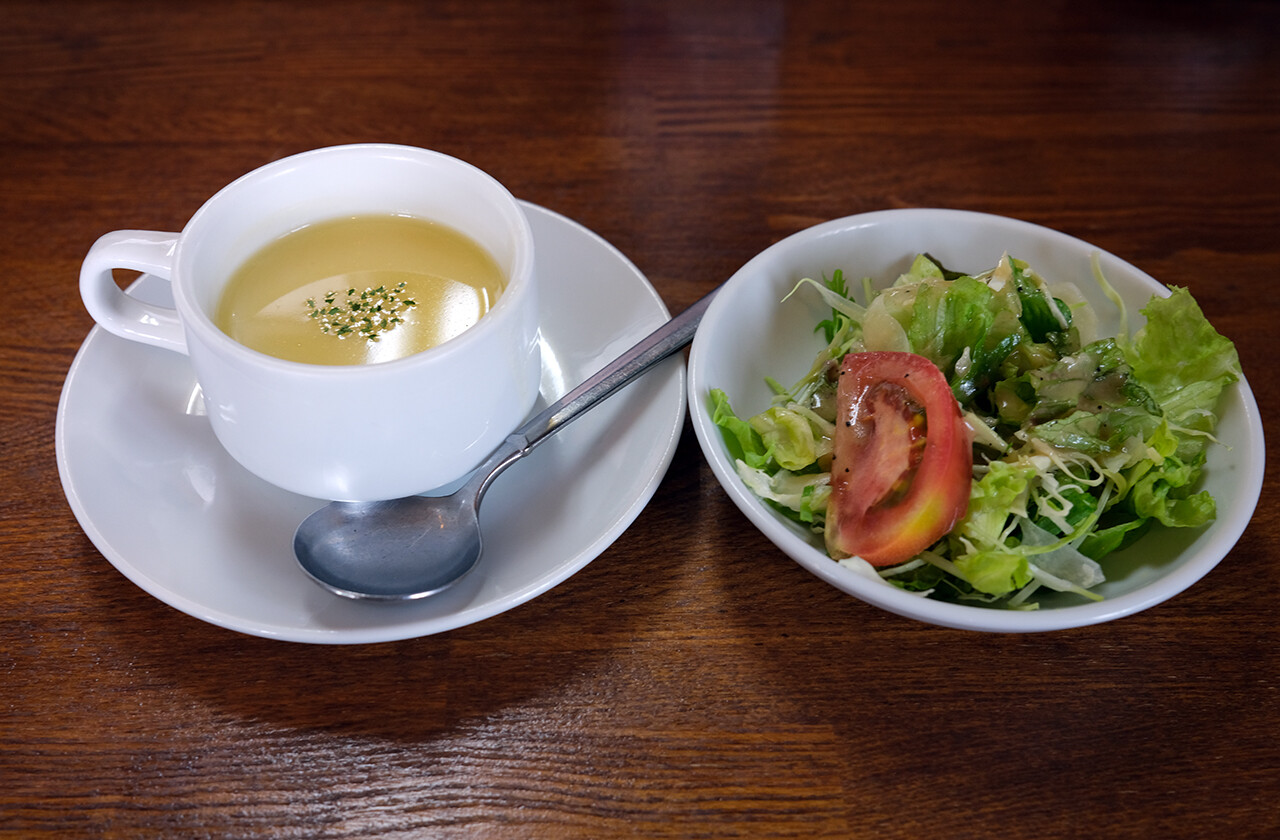午前中仕事して、昼前に【FAKE IT COFFEE】でアイスラテ飲んで、お昼は【キッチンポアレ】へ。13時過ぎてたけどほぼ満席。マスターに「お昼に珍しいですね」と声かけてもらって、カウンターに1人入れてたのでハンバーグ定食をいただき。カニクリームコロッケは売り切れ。ハンバーグも美味しいのよね。