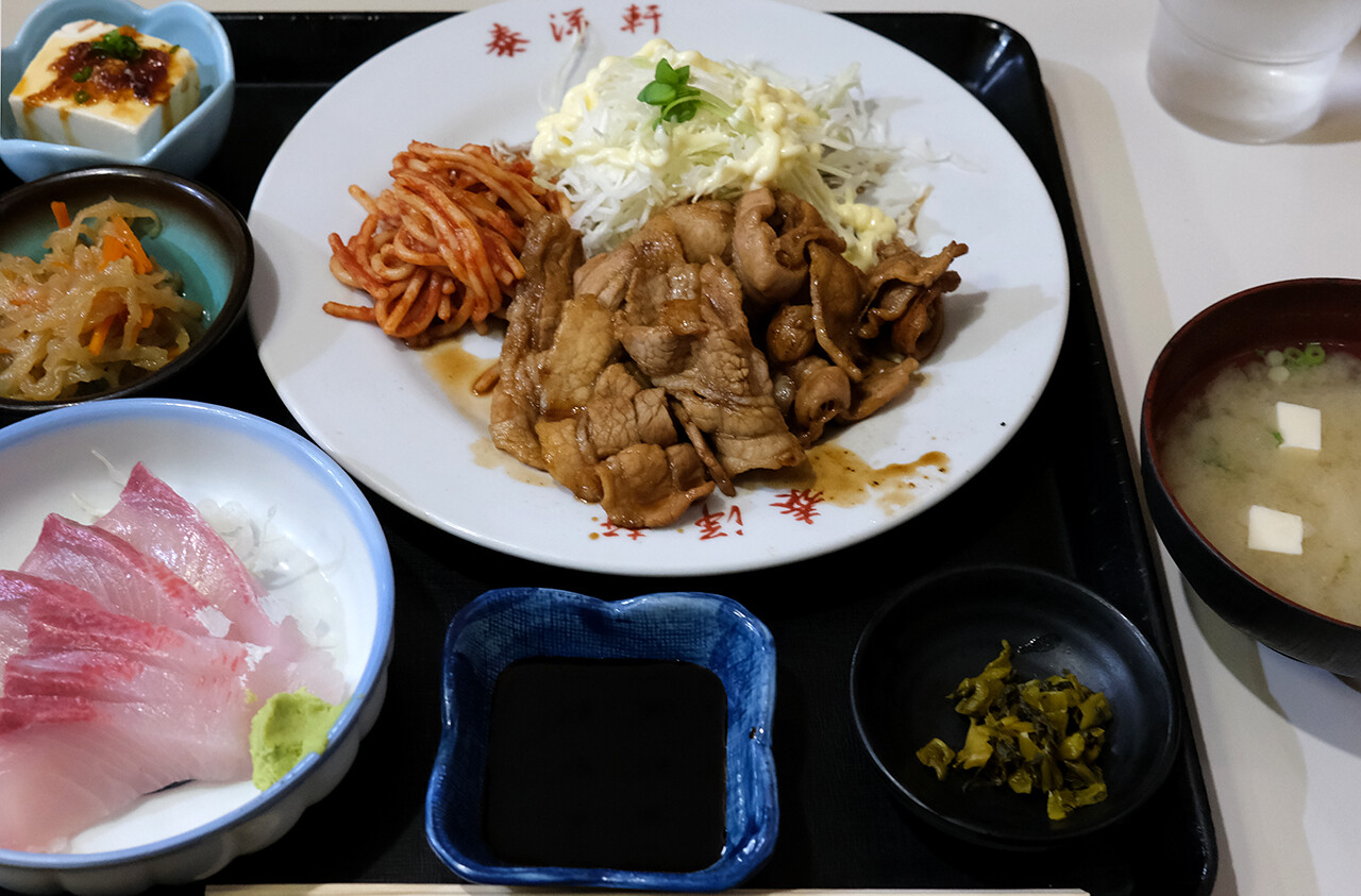 数え切れないくらいメニューが貼ってある壁をぼんやり見てたら、刺身定食を発見。刺身でさっぱりもいいなぁと思って、「すみません、やっぱり刺身定食に変更できますか?」と聞いたら「大丈夫ですけど、生姜焼きに刺身のセットもプラス出来ますよ」と笑顔で返してくれた。「じゃあ、それでお願いします」と注文。