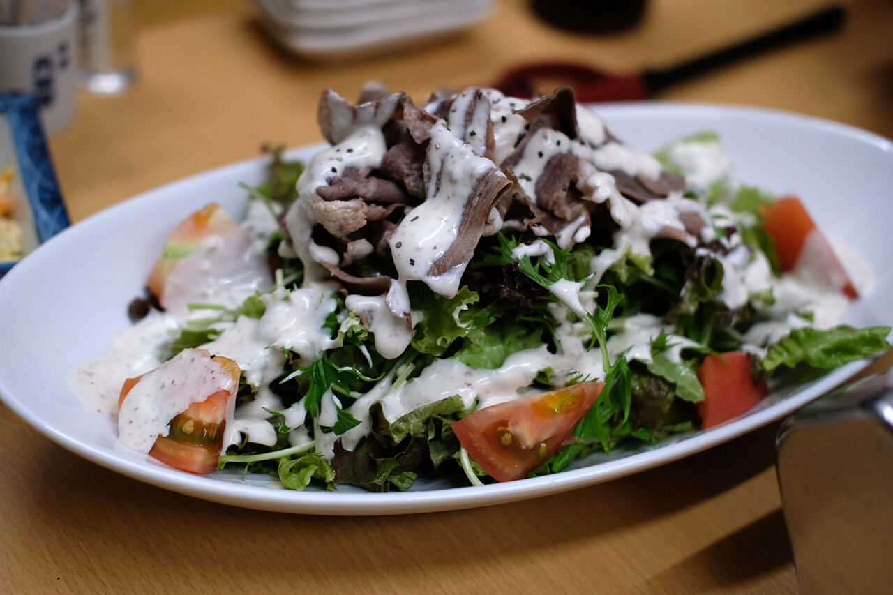 とりあえずサラダや一品料理を注文。そしておすすめのお肉と続けたらすぐ気づいたけど、「デカっ!!」