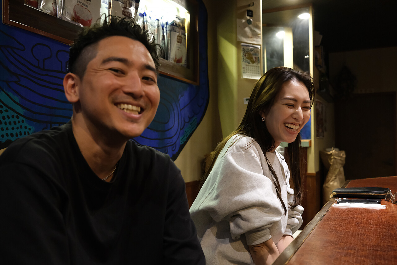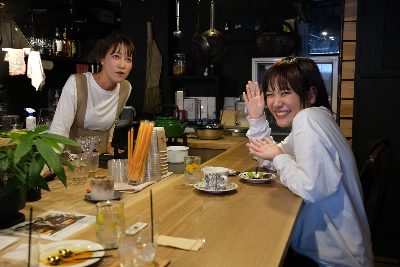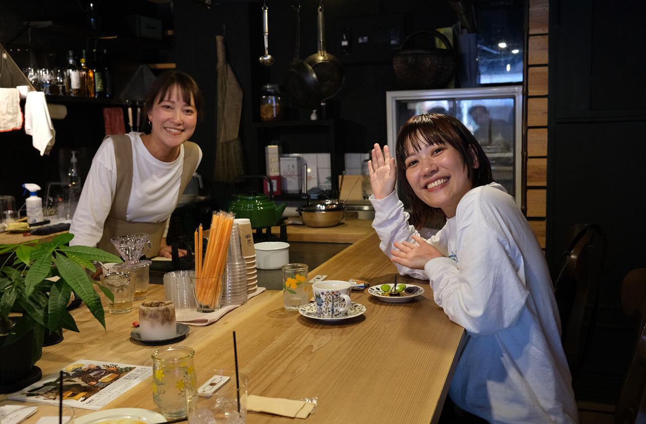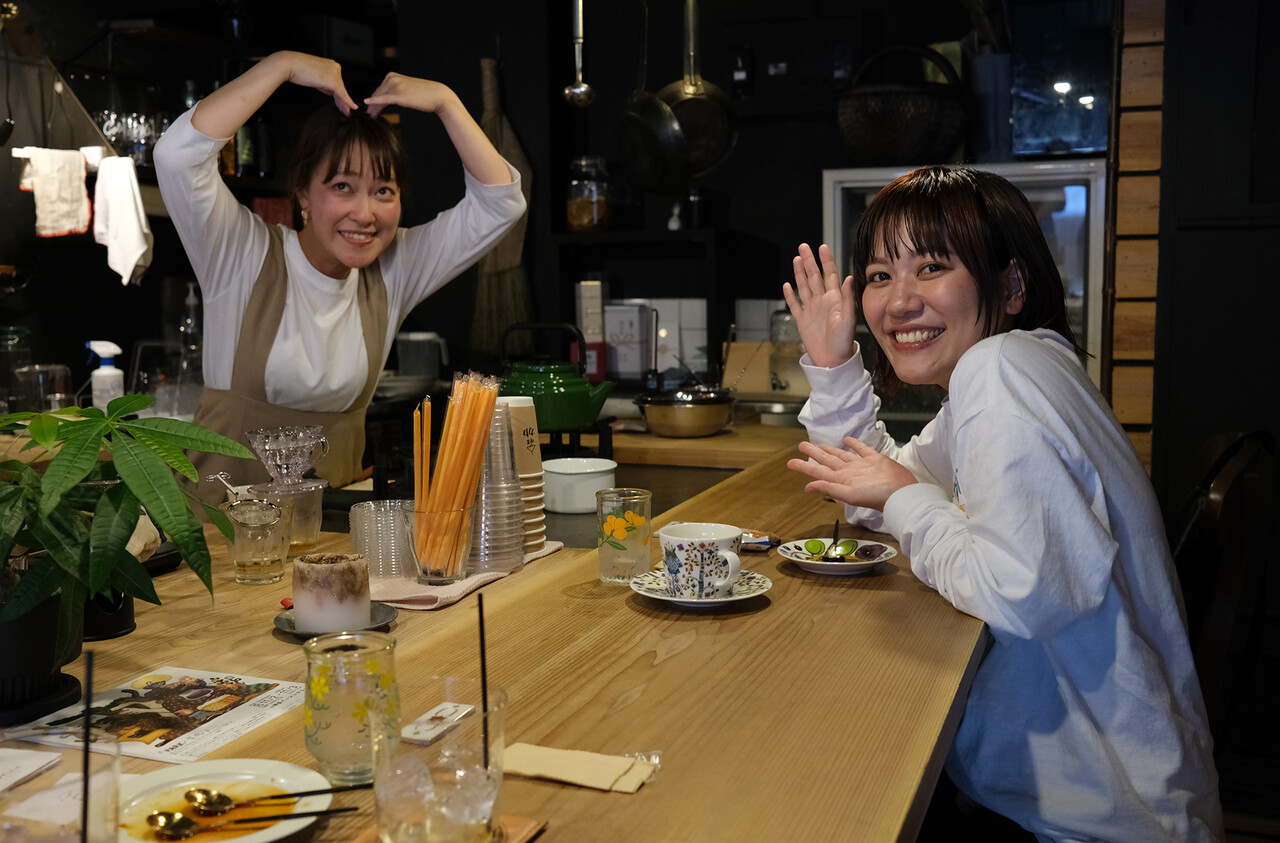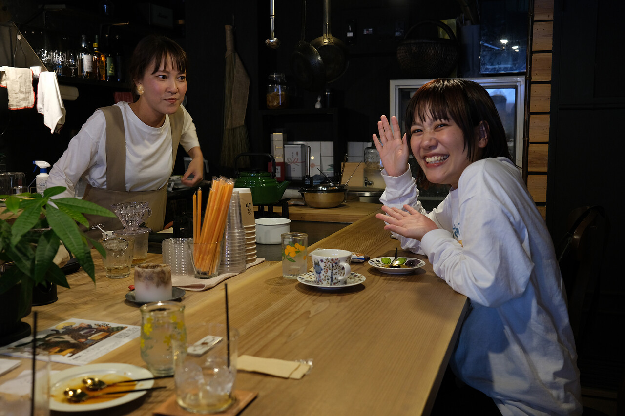 【喫茶カヤ】でラジオパーソナリティの坂口カンナちゃんに遭遇。この二人は以前【あだち珈琲警固店】での同僚なのだ。写真は「変な顔してみて」という僕のリクエストに応えてくれてるところ。