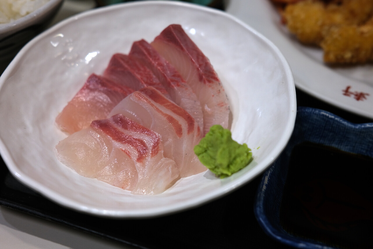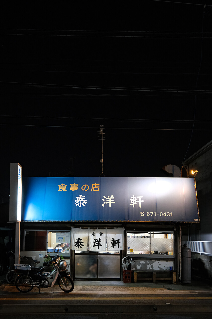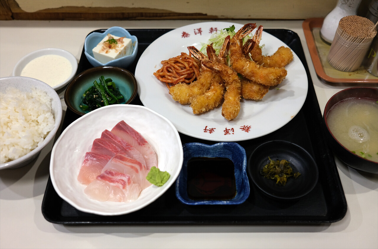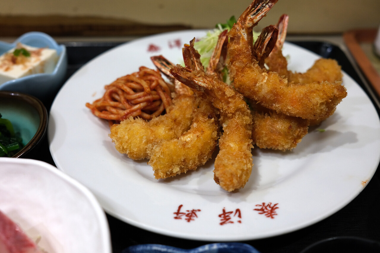 こんばんは。昭和ノスタルジストの万太郎です。今夜も昭和感溢れる東区名島にある老舗人気食堂【泰洋軒】で晩ごはん。今回は海老フライ定食に刺身追加。料理も佇まいも昭和感があってたまらん幸せな時間。