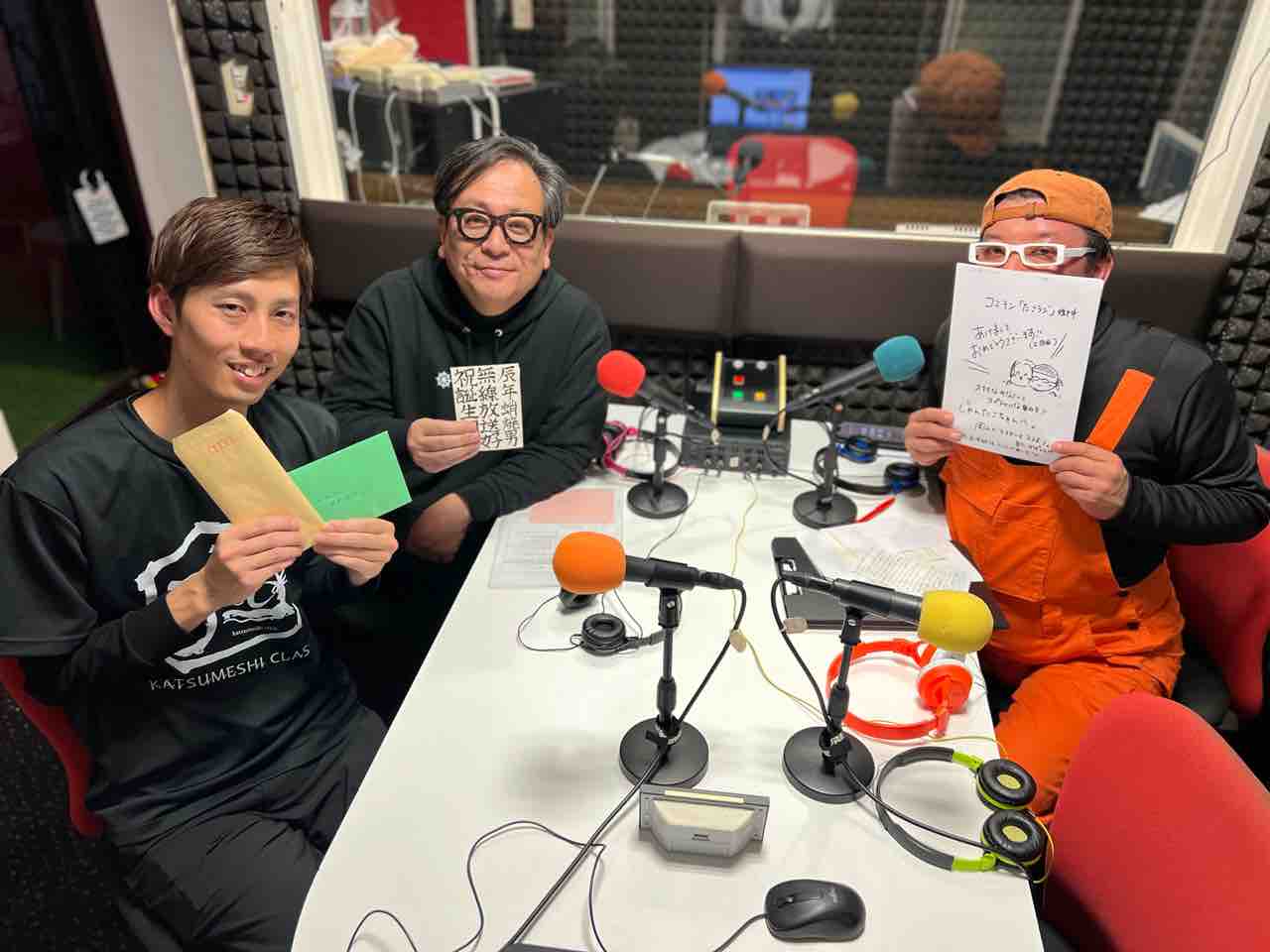 食後にみんなで「コミュニティラジオ天神」に移動して「たこラジ」の生放送でした。
