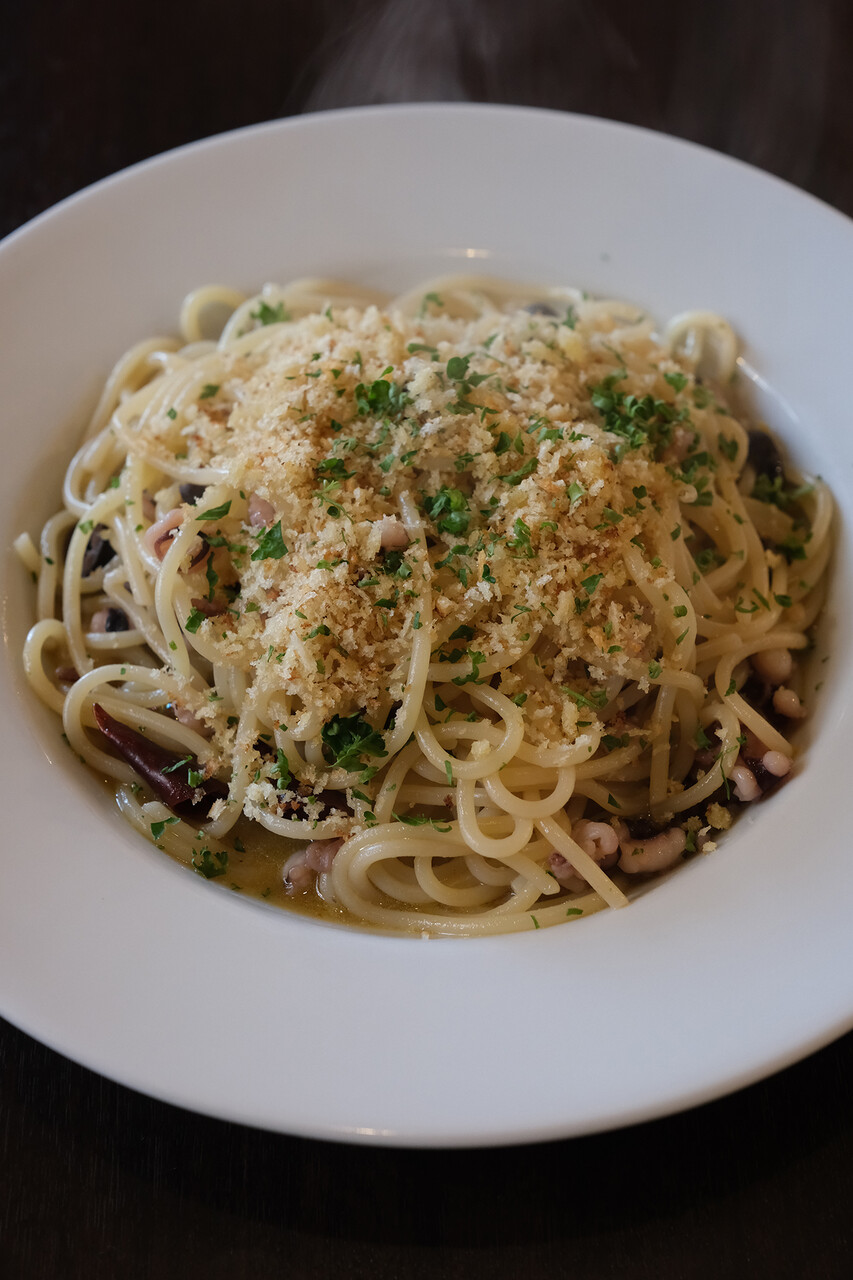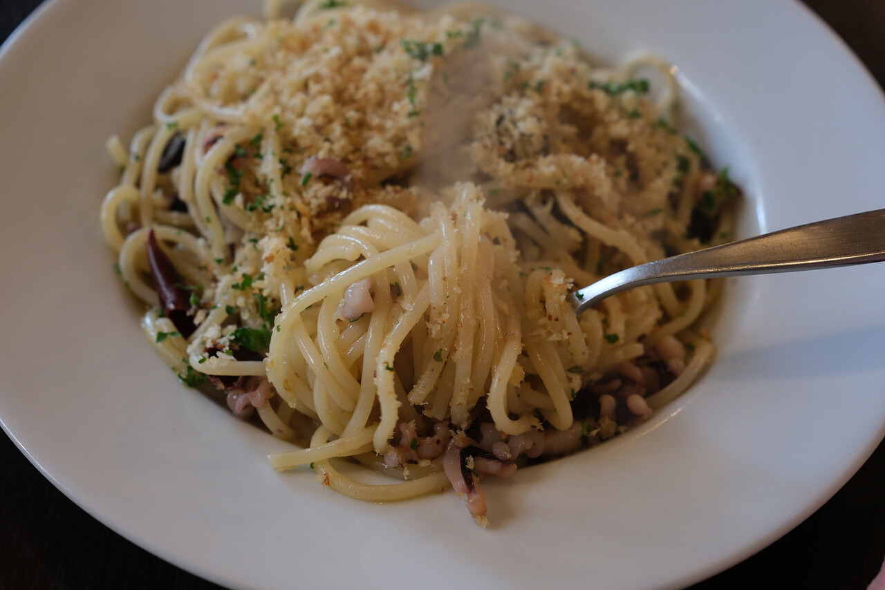 お昼は久しぶりに志免町【アンジェロ】でモチモチ生麺パスタのランチ。ソースは日替わり3種の中から、蛸とオリーブのペペロンチーノを注文。モチモチ生麺が美味しいのでここに来たら大盛り注文が通常になってきた。前菜盛り合わせやデザート、ドリンクセットなどの組み合わせがいろいろ可能。お昼から女子会や家族連れや老夫婦がビール飲みながらとか、のんびり出来る雰囲気のお店です。