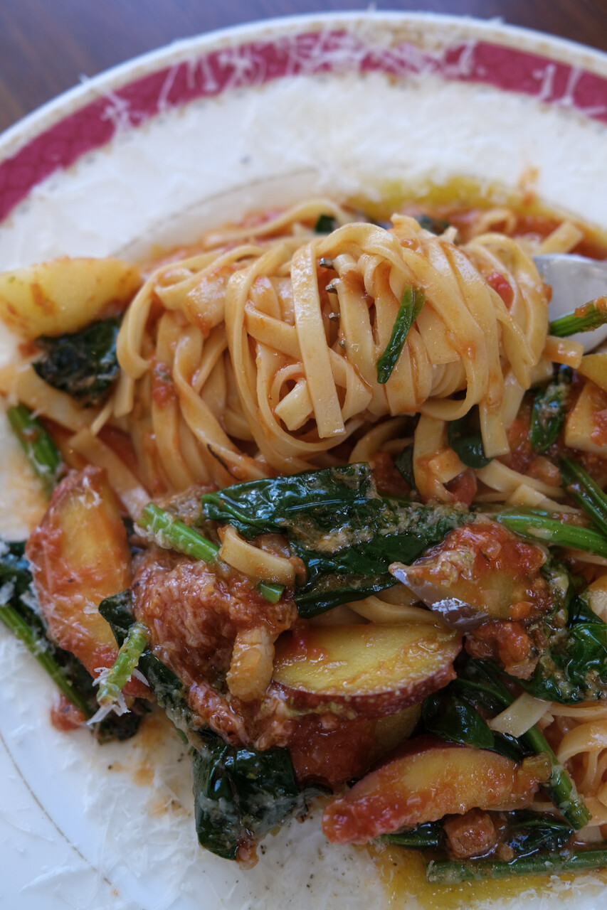 昨日のお昼は【カンパニョーラ】でパスタランチ。今日はトマトソースに平麺を選択。 自家製生麺のモチモチ感、ベーコンの香りとトマトの酸味と甘さ。サツマイモやジャガイモや青菜など野菜たっぷり。美味しい。ソースはトマトの他にクリームか和風があります。パン、サラダ、デザートが付いて平日ランチタイム1,375円(税込)。