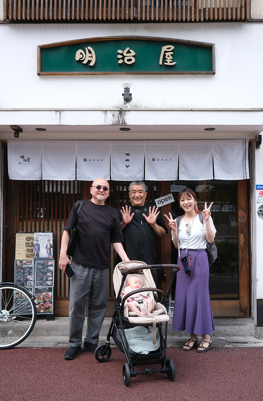秋にカイタックスクエアガーデンで開催されるイベント打ち合わせのためにデビ高橋さんとお昼ご飯を兼ねて【炭火博多焼肉 明治屋 古門戸店】で待ち合わせ。ここは、夜ももちろんおススメですが、お昼も1,000円前後で数種類のランチをやってますよ。奥様であるカナちゃんとベイビーも一緒に集合したので記念写真。