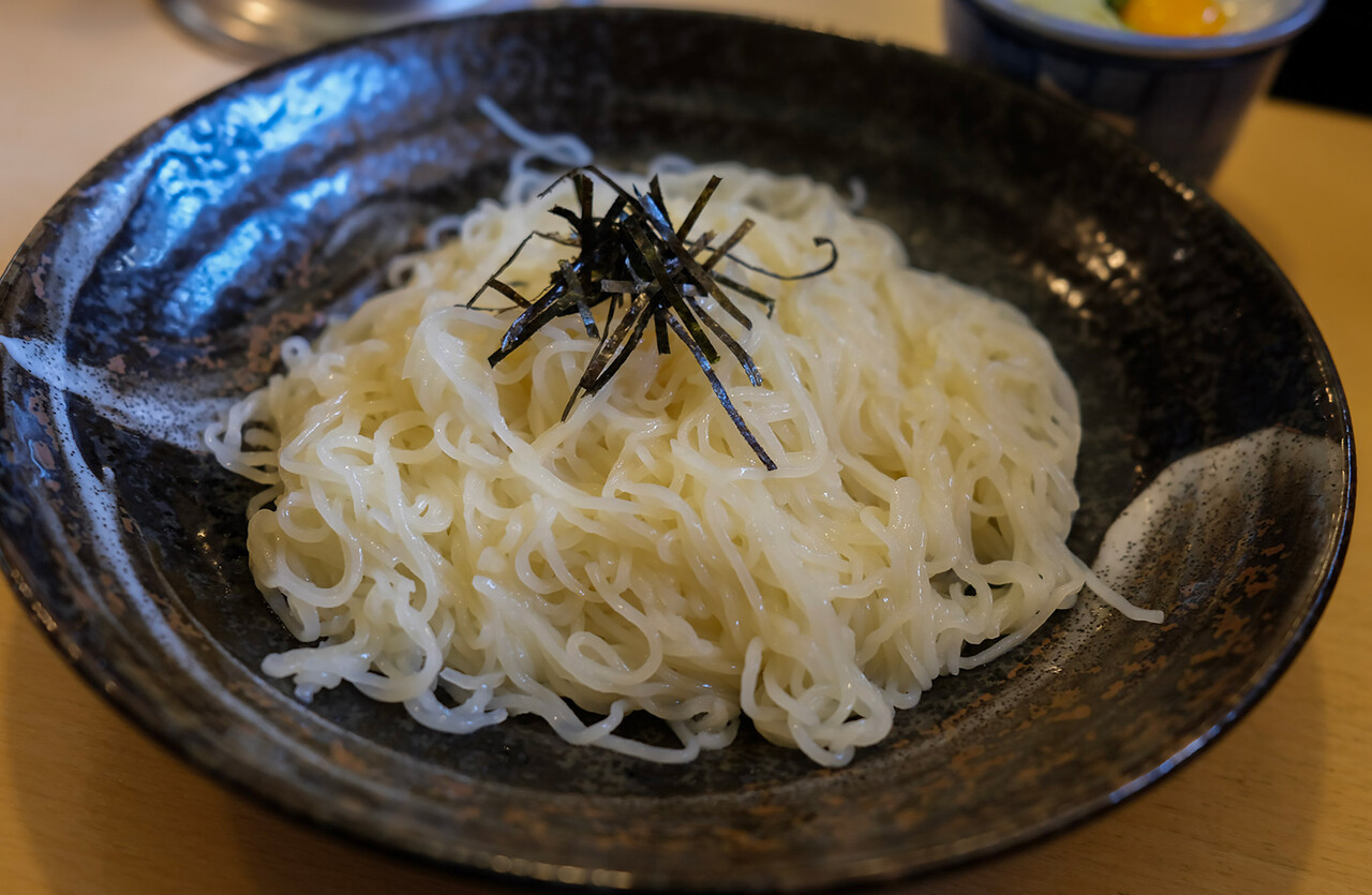 お昼14時半くらいの【葉隠うどん】で、ざるうどん(細麺)とお稲荷さん。この時間でも大賑わいだね。外国からのお客さんも多いらしい。