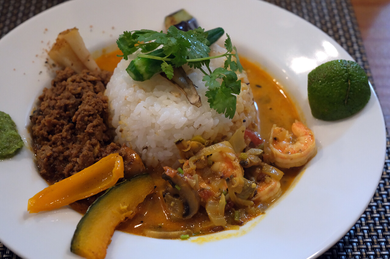 今週も【千酒万菜 うちだ産業】が3連休でホリデーカレーランチしてたので、仕事途中にカレーランチ。先週はグリーカレーとキーマ。今日はシーフードカレーとキーマの組み合わせ。名物になってる夫婦が揉めてる風の小芝居は今日も見られました。「夫婦激場は日常茶飯事です」と言う貼り紙は伊達ではありましぇん。