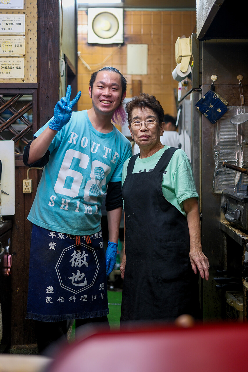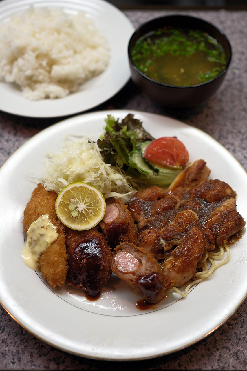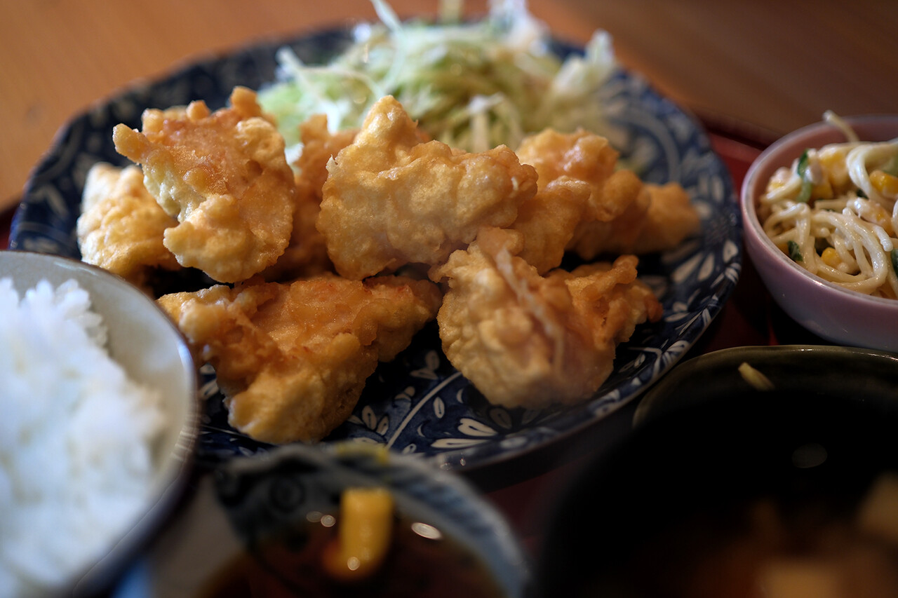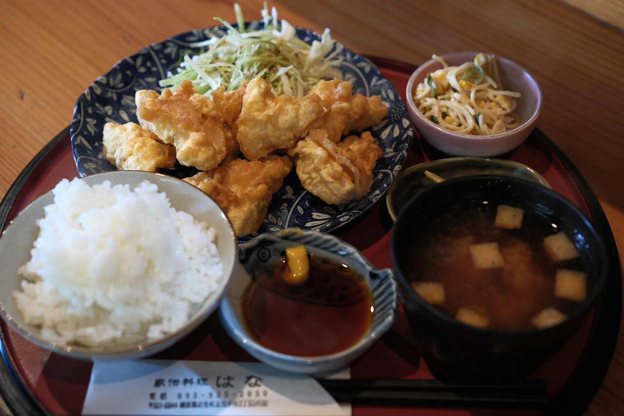 志免町【家伝料理 はな】は大分郷土料理の店。お昼は食堂、夜は居酒屋。とり天、だんご汁、ちきん南蛮、塩サバ、トンカツ、唐揚げ、オムライスとかいろいろあるよ。お祖母さんとお孫さんが切り盛り中。