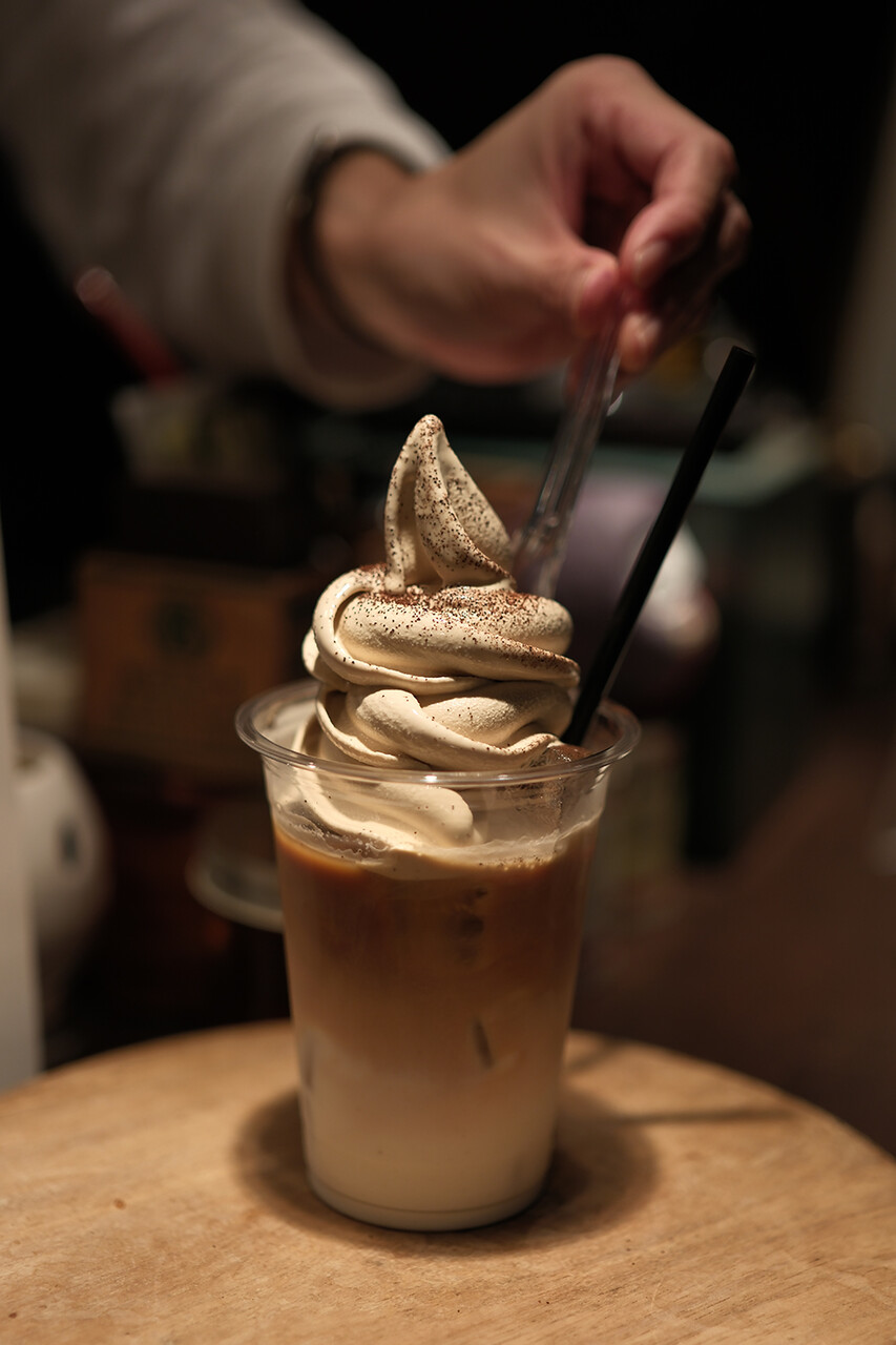 そんなこんなで今夜もソフトクリーム試食。アイスカフェラテに載せてみた。