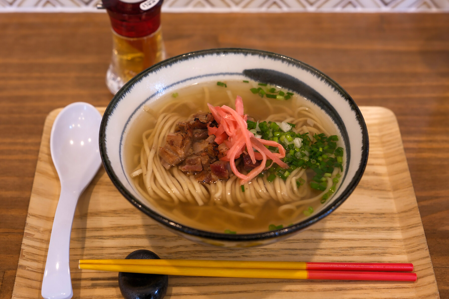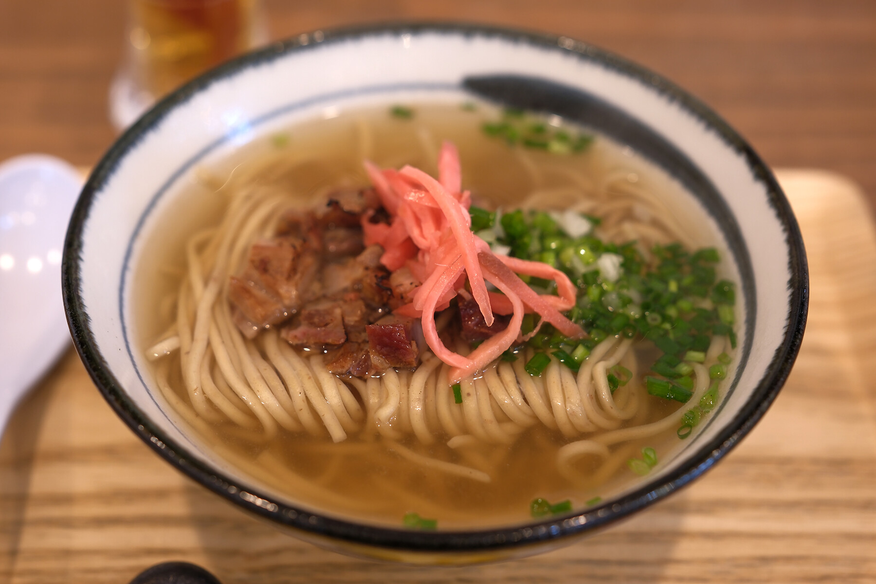 写真と順番は違いますが、【バソキ屋】の本部が経営している美野島商店街にある【吟麦製麺】。製麺所で麺料理が食べられる店。土日祝日は朝8時から営業しているというのでモーニングヌードルの沖縄そば550円をいただき。吟麦を使った自慢の自家製麺。麺の量は同じ値段で増やせます。混ぜご飯のおにぎり1個100円。店に入る前に入口右側の券売機で購入。おすすめです。