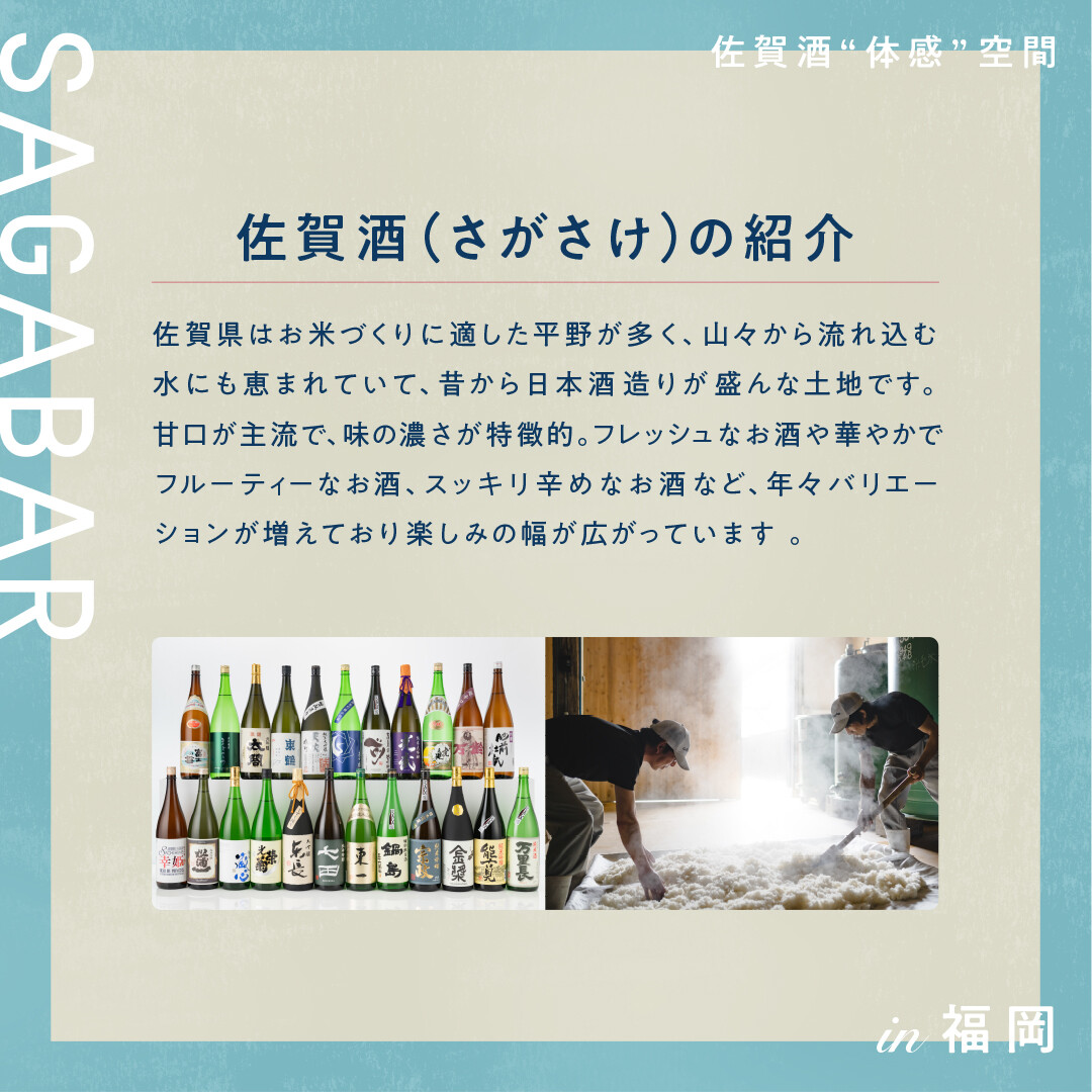 佐賀酒”体感”空間SAGA BAR in 福岡とは、福岡県内の4店舗がSAGA BAR仕様になり、各店舗がセレクトした佐賀酒や佐賀県産食材を使った特別メニューをお楽しみいただけます。