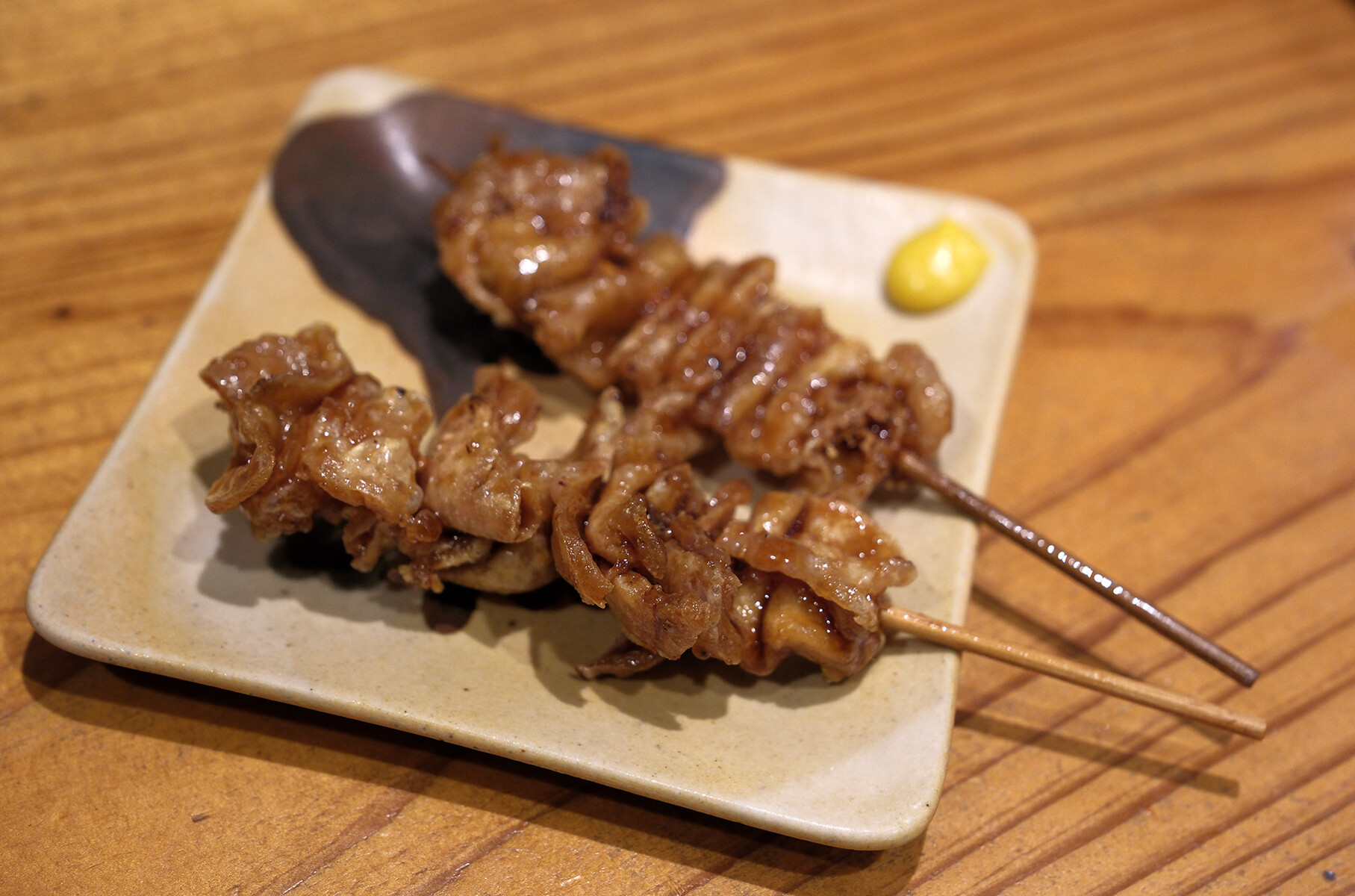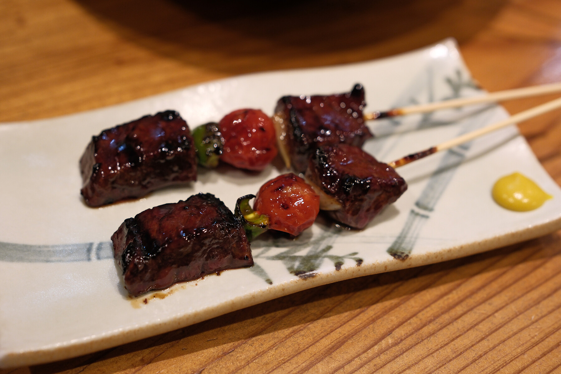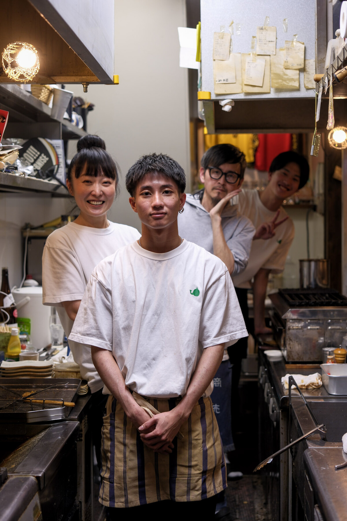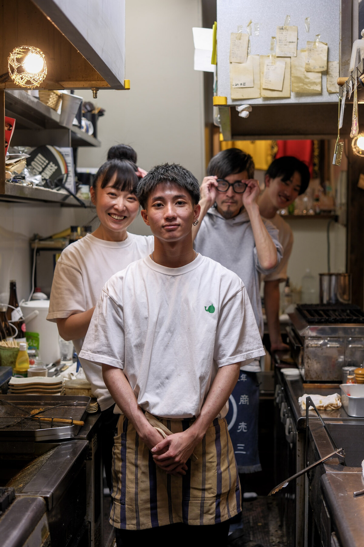 安くて美味しくて地域に密着した焼き鳥屋さん。年に2回の定期訪問と定期記念写真。今回のピント主役は東区からバイトに通ってる青年でした。
