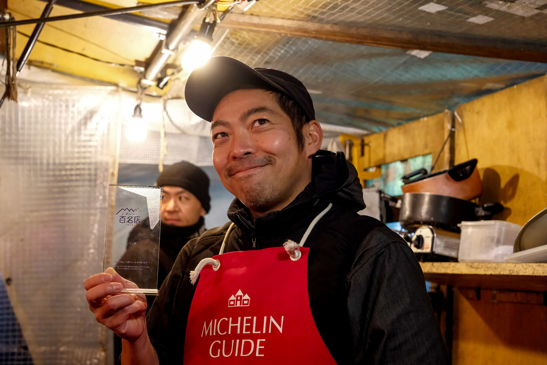Amazonで買ったというミシュランの赤いエプロンを着て、知り合いのお店の有名グルメサイトの“百名店”の盾(アクリルトロフィー)をもってニコニコ顔の鳥巣社長です(笑)