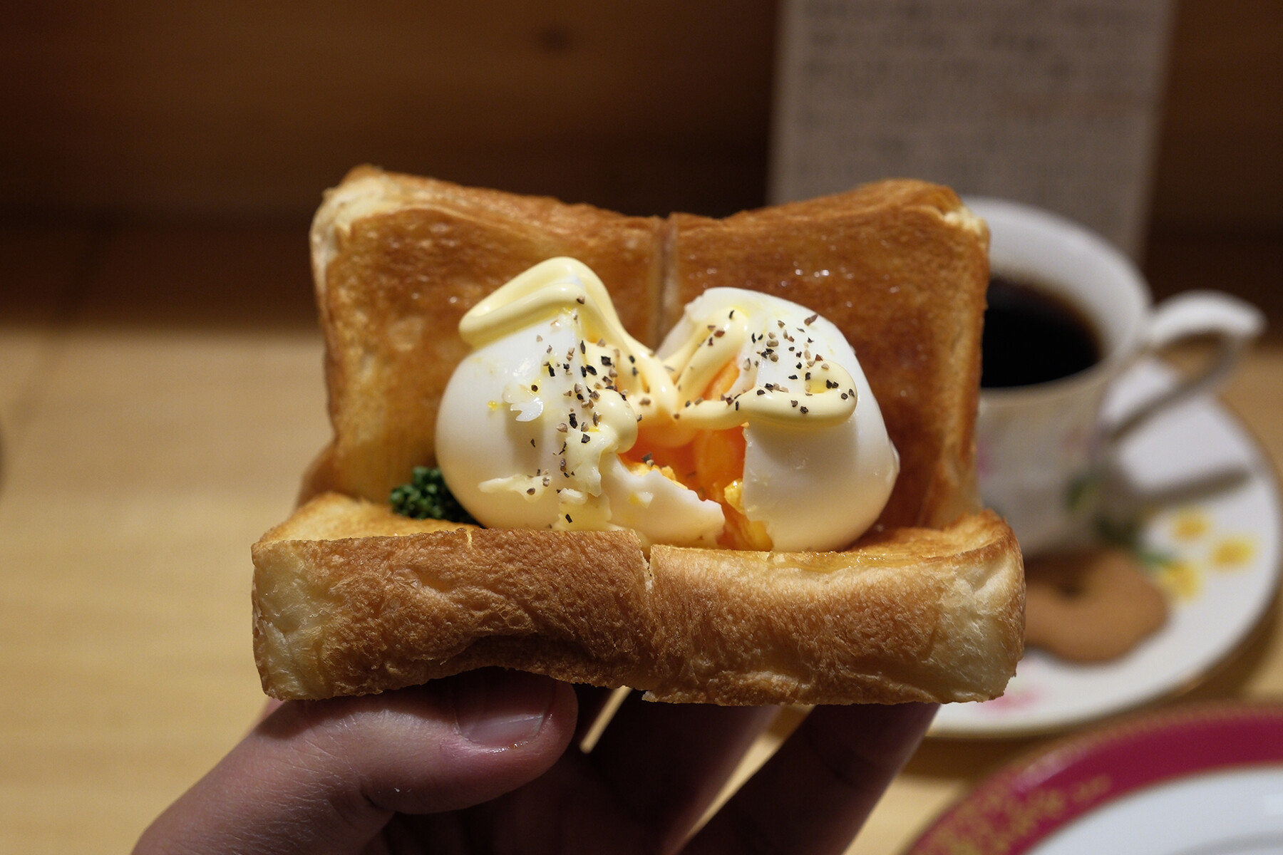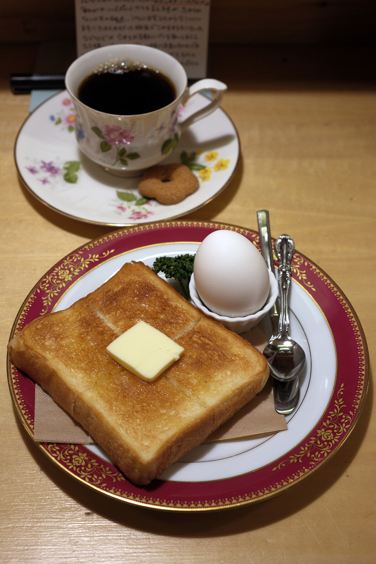 祝日の朝8時過ぎ。会社行く前に【銀杏の木】でモーニングサービス。お隣になった常連女性客とお話しながら朝ごはん。一緒に出された珈琲とトーストたち。ゆで卵をパンに挟んでいたら、店主のしのみちゃんがマヨネーズとブラックペッパーをかけてくれた。玉子サンドにして食べ終わって隣を見たら、お隣さんはまだゆで卵の皮を剥いている最中だった。「早っ!!」って言われたけど、俺からしたら「この数分間、何してたんですか?」って感じだった(笑)