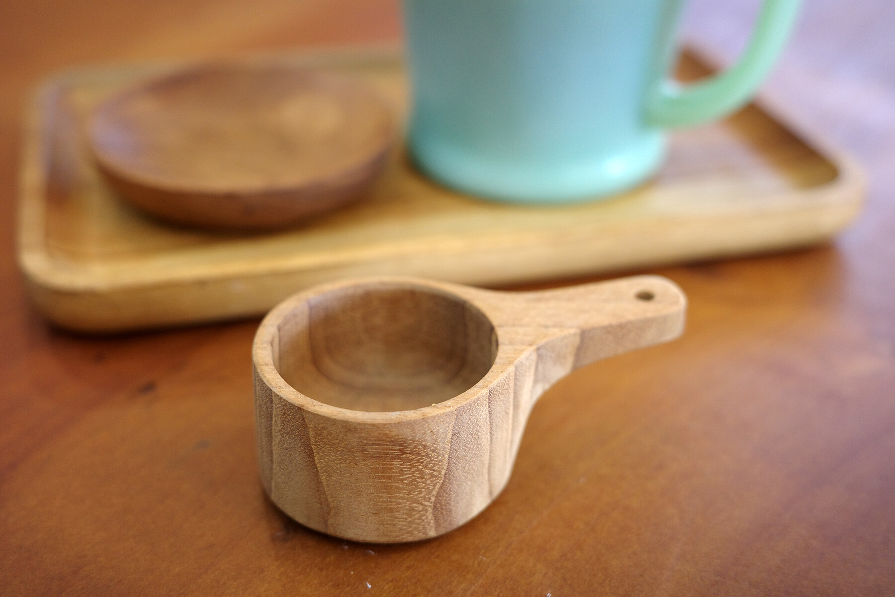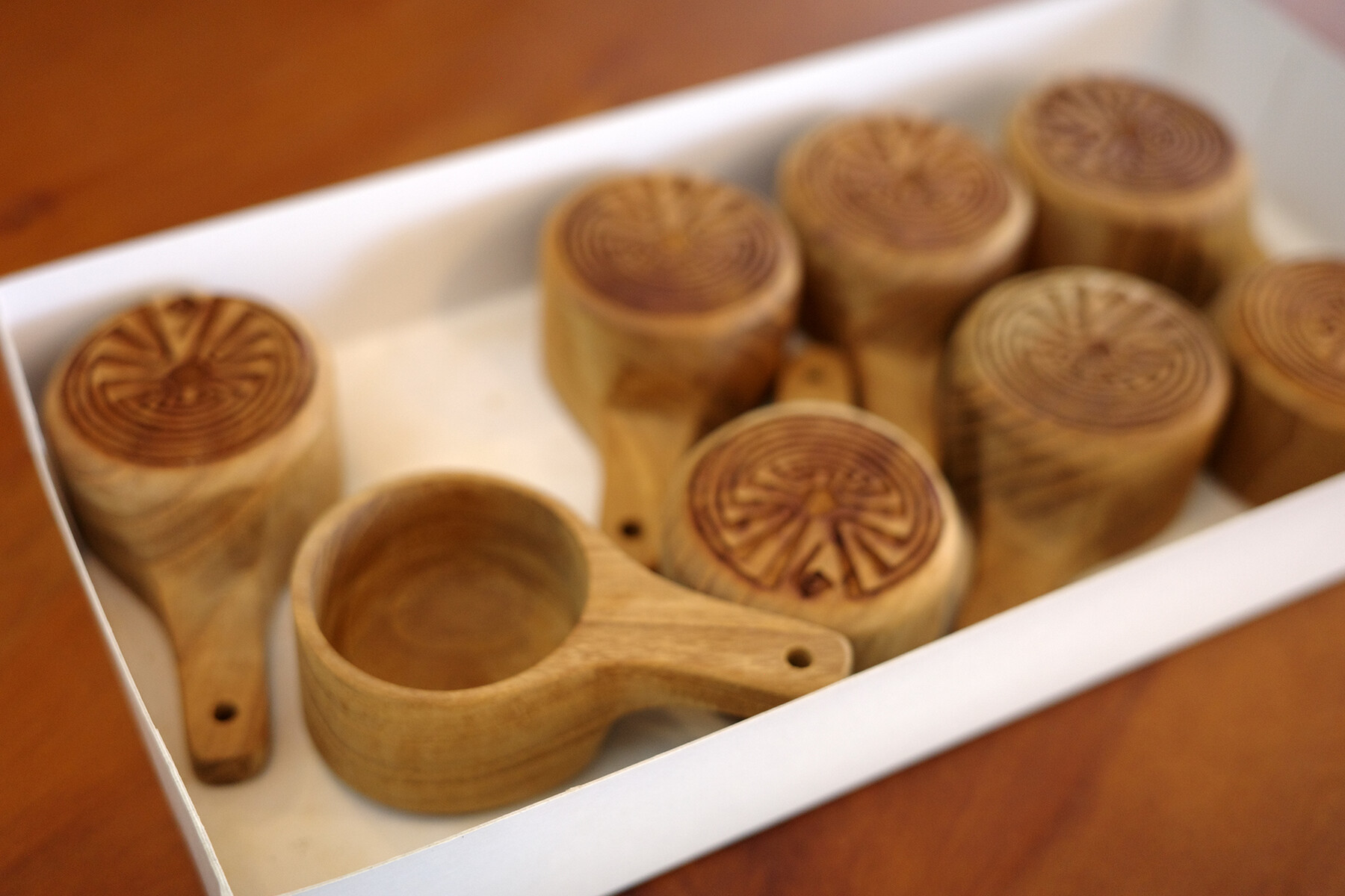 【ラ・フランス】で買ったパンは【ホピ珈琲】へお土産。代わりにというかキャンプお祝いにオリジナルの木彫りコーヒーメジャースプーン(10g)をもらった。