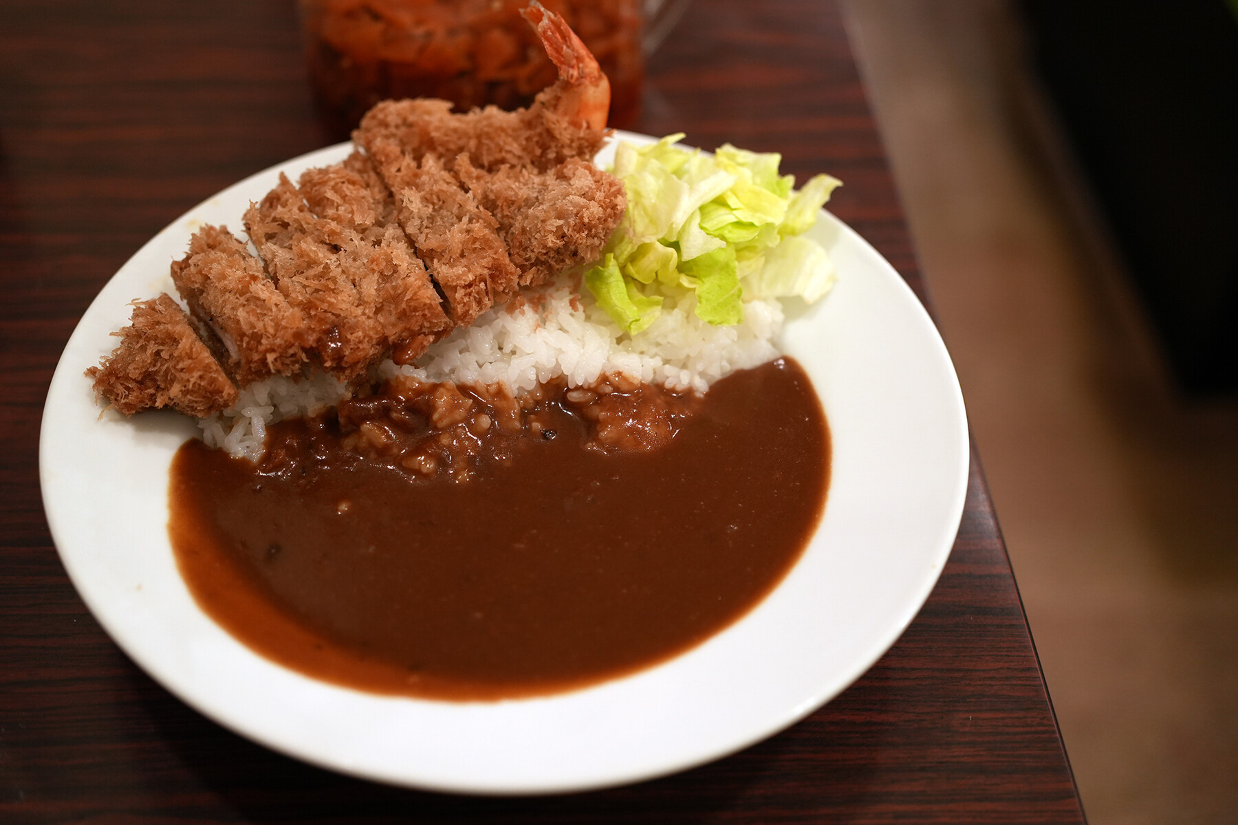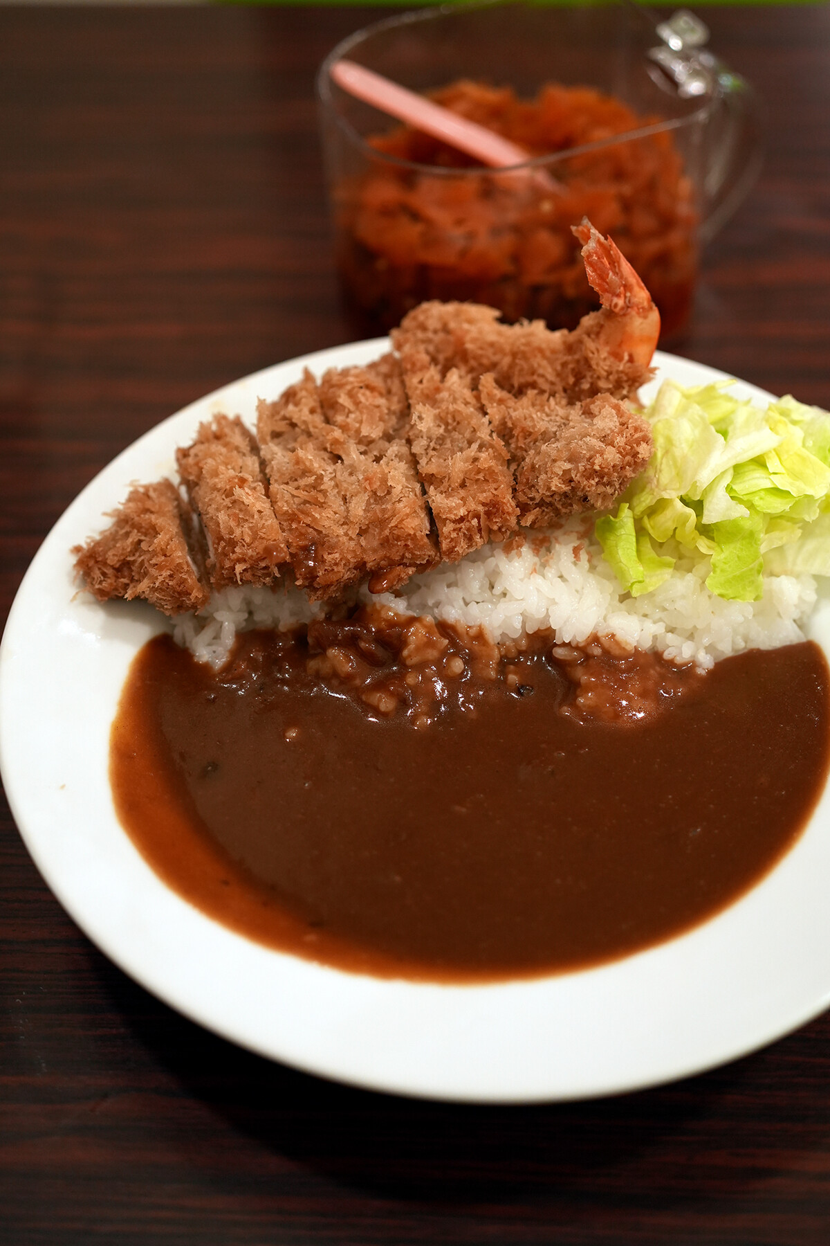 月曜日夜に【かつ新】でカツカレー(ご飯大盛り)に海老フライ一本、それに味噌汁追加で1,050円なり。