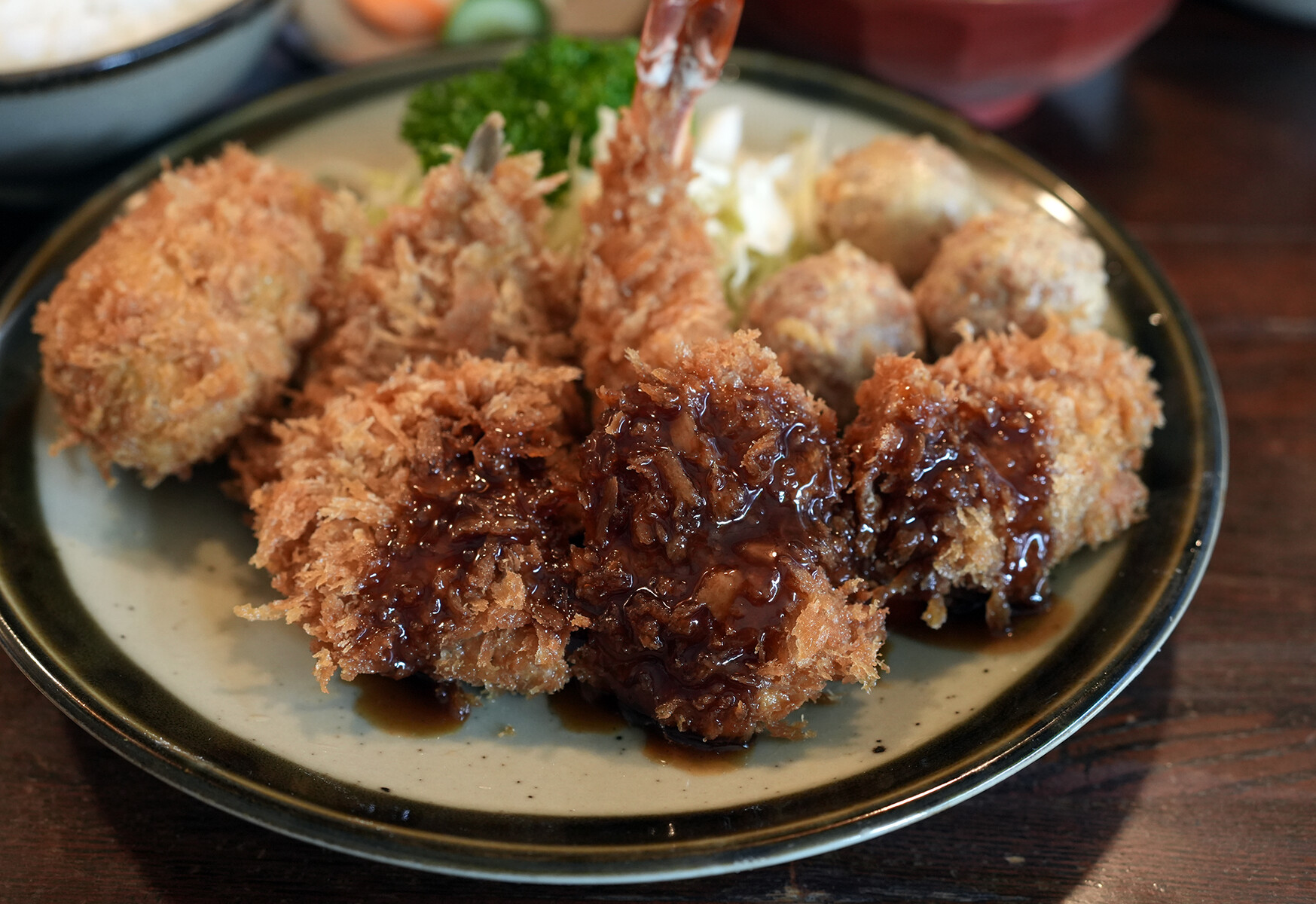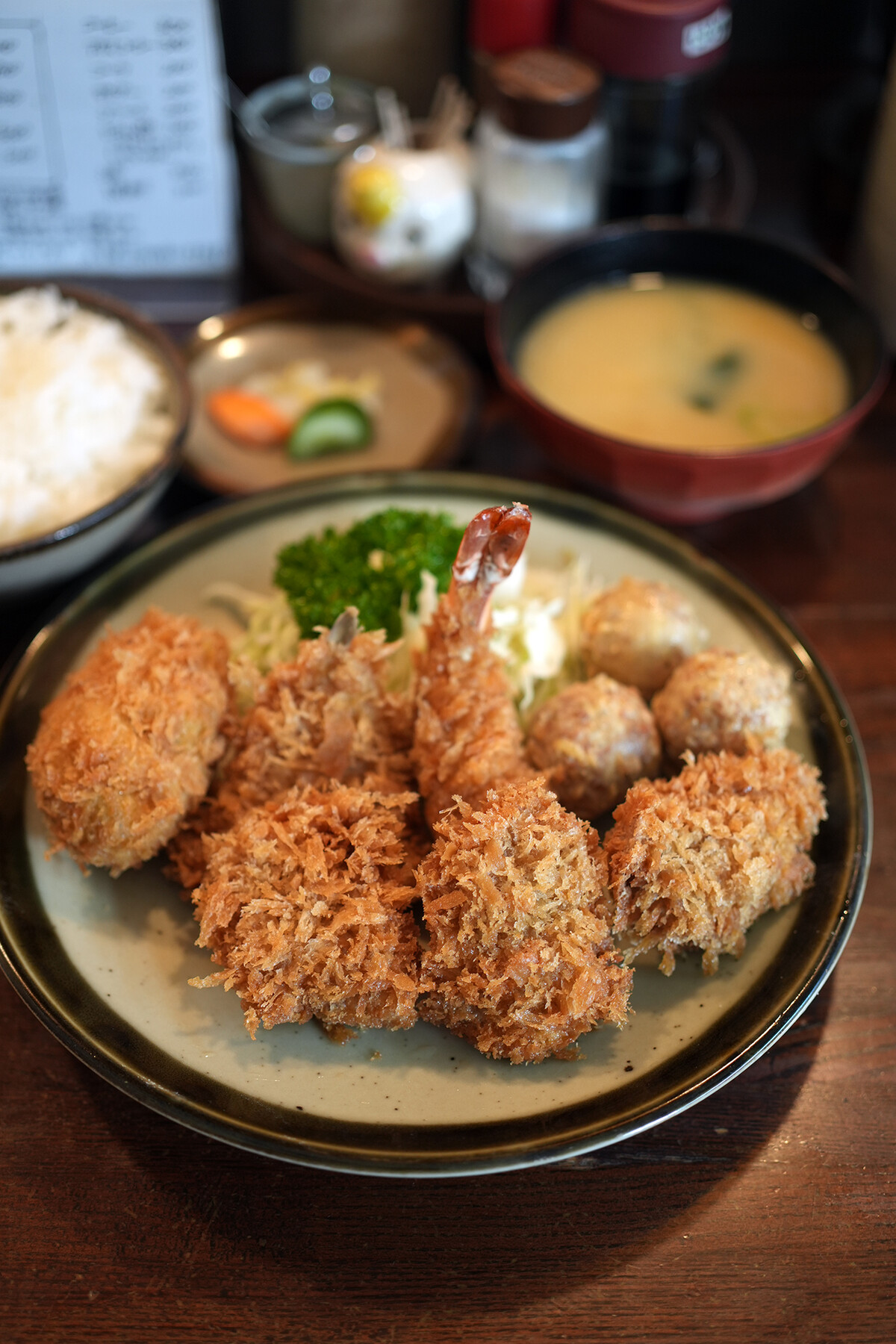 【かつ新】で三色カツ定食にコロッケと海老フライ追加。入居されてる玉川ビルの排水管修繕工事が行われているため、7月12日から【かつ新】は休業になります。予定では3週間から1ヶ月くらいらしい。うまくいけば8月上旬に営業再開予定。