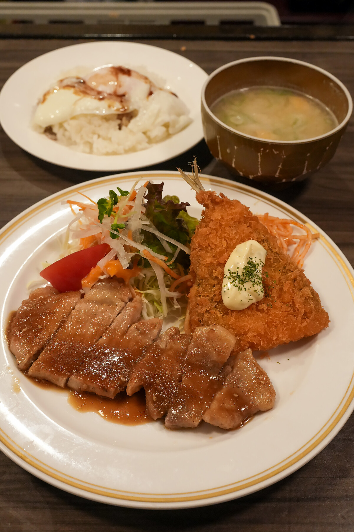 仕事帰りに【洋風食堂 枝】で日替わりランチに目玉焼き追加。1,050円なり。カウンターに座ってテレビを観ながらの晩ごはん。