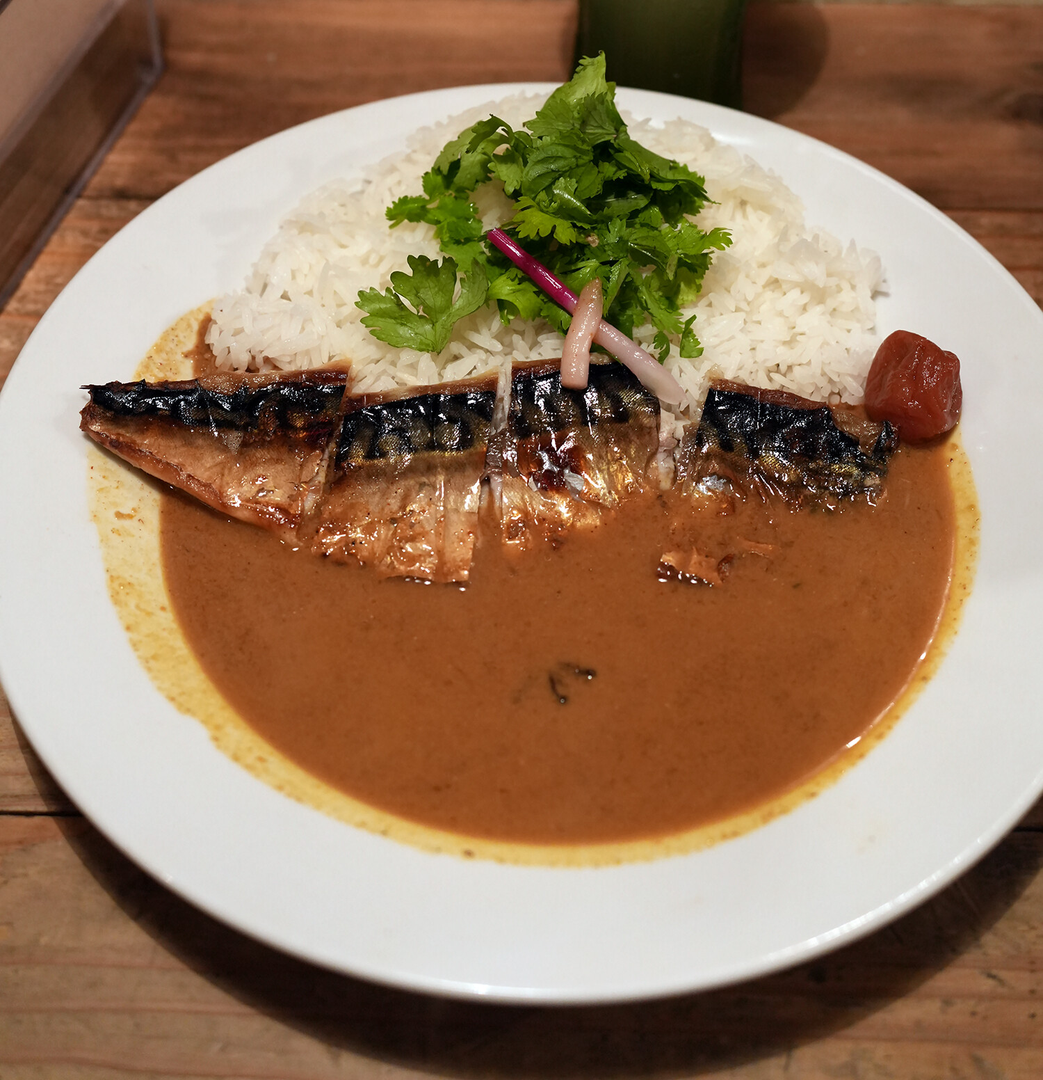 そして“夜ティキ”限定メニューで最近売り出し中の、ノルウェー産の焼き鯖がのったスリランカ寄りカレー。食べに行こうと思ってたけどまだ行けてなかった鯖カレー。そしたら数日前、トシさんから「万太郎さんは魚が嫌いなんですか?」と連絡あったので「大好きですよ…」と返事。