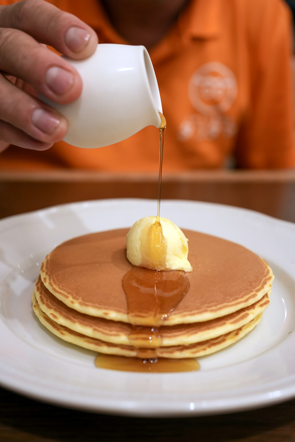 全身オレンジ色のたこ焼きマンこと【こめもん専門店 タコタマ】と【ロイヤルホスト塩原店】で打ち合わせ。食後にパンケーキ🥞。注文受けてから丁寧に1枚ずつ焼き上げられる人気メニュー。ChatGPT曰く『外はカリッ、中はふわっ——幸せを重ねたロイホの黄金パンケーキ』だそうです。さすがです。