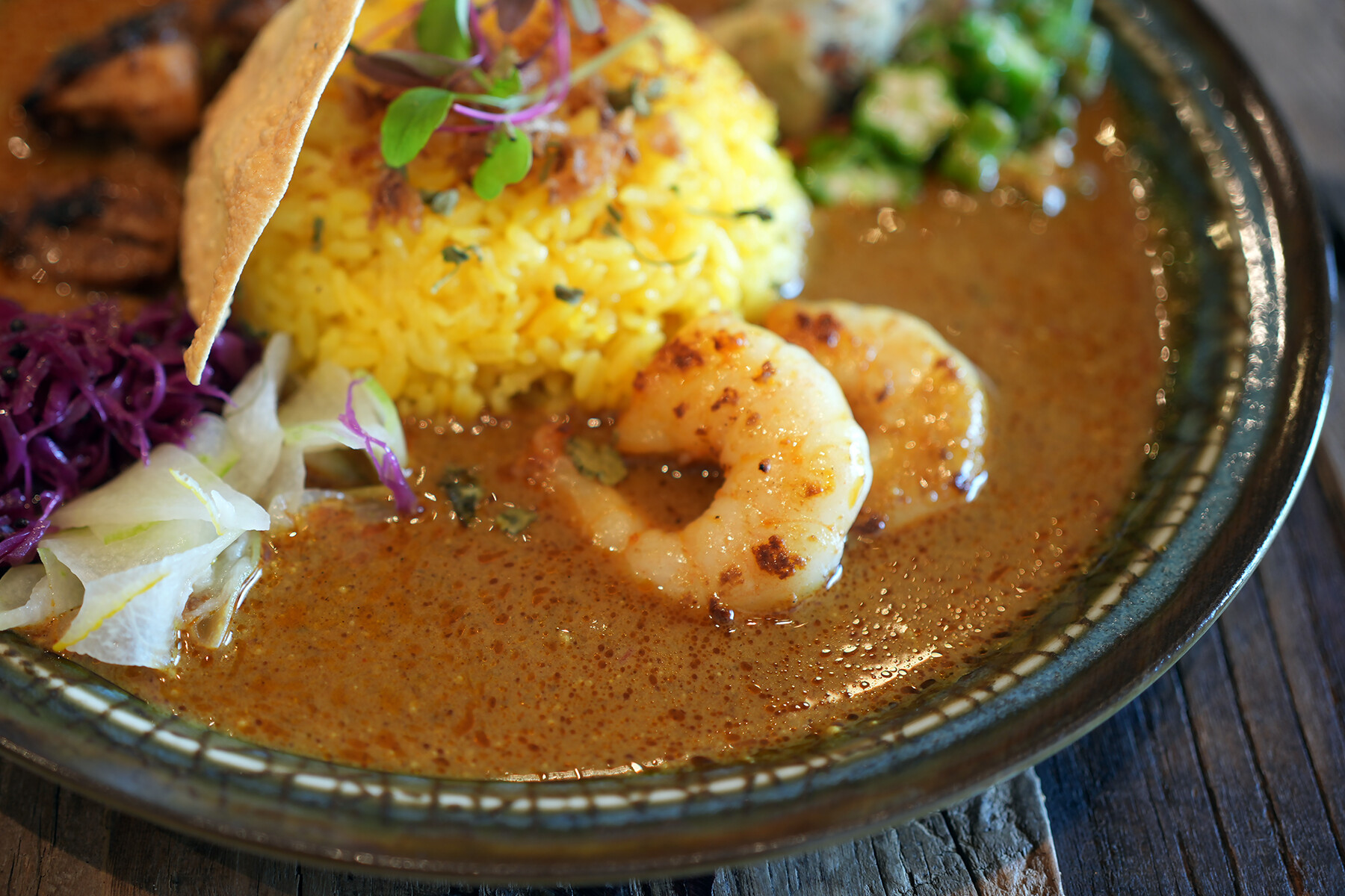 11時OPENに合わせて【スパイス食堂 and N】。7月18日に粕屋町にOPENしたフレンチ料理人が作るスパイスカレー。今日は水曜日だったので限定カレーがあった。今回は海老カレー。ということでチキンと海老のあいがけをいただき。とにかくお店の人の笑顔が素敵なので来月の『UMAGA』で取材させてもらうことにした。