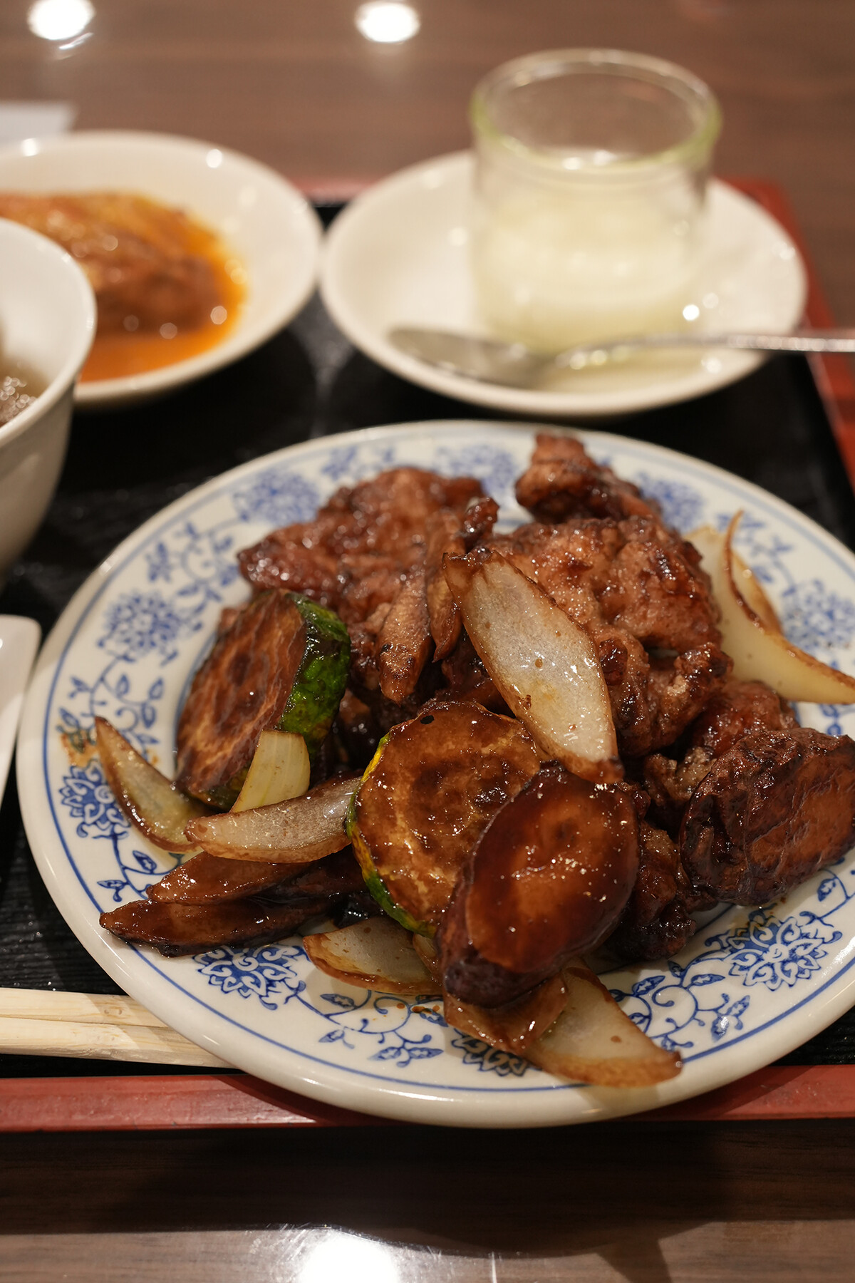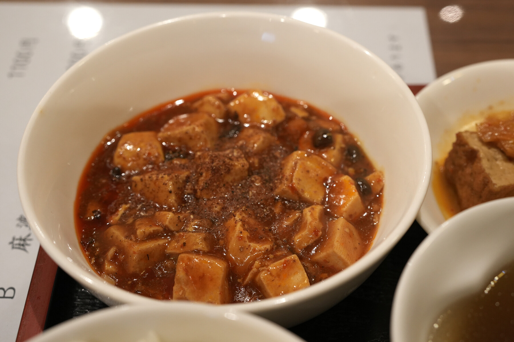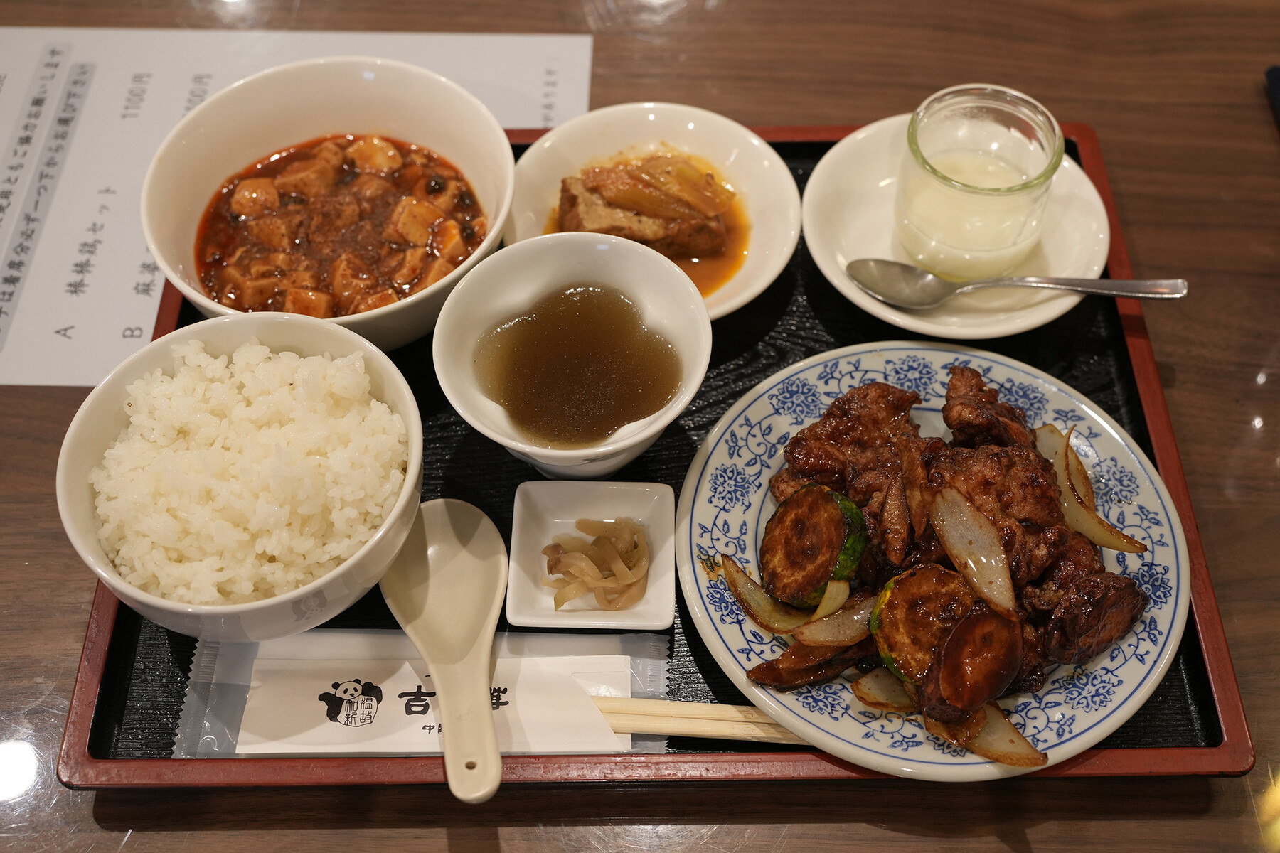 定食3種類でそのうち1種類が時々メニュー変わるらしい。それに自慢の担々麺もあり。綺麗なお姉さんに勧められたままに、鶏肉の定食(1,100円)にミニ麻婆豆腐(300円)を追加。大満足。